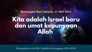 Kita adalah Israel baru dan umat kepunyaan Allah yang dikasihi-Nya yang telah dipilih Tuhan Yesus Kristus dan telah diselamatkan lewat kematian Anak-Nya di kayu salib. kita juga adalah manusia lemah yang berdosa dan penuh pelanggaran yang tidak layak dihadapan-Nya. Namun oleh karena Dia telah memilih, mengasihi dan menetapkan kita sebagai Anak dan pewaris kehidupan yang kekal, Ia telah menutupi semua kesalahan, pelanggaran, keberdosaan dan kecemaran kita dan berjanji akan senantiasa menyertai kita.